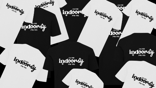 “I’M TOO INDOORSY FOR THIS” IS A MINIMALIST COLLECTION FOR COMFORT-LOVERS WHO PREFER HOME. PLAYFUL YET BOLD, IT CELEBRATES REST, COZINESS, AND CHOOSING COMFORT WITHOUT APOLOGY—ROOTED IN INDOORSY’S MESSAGE OF MENTAL WELL-BEING AND FEELING AT HOME ANYWHERE.